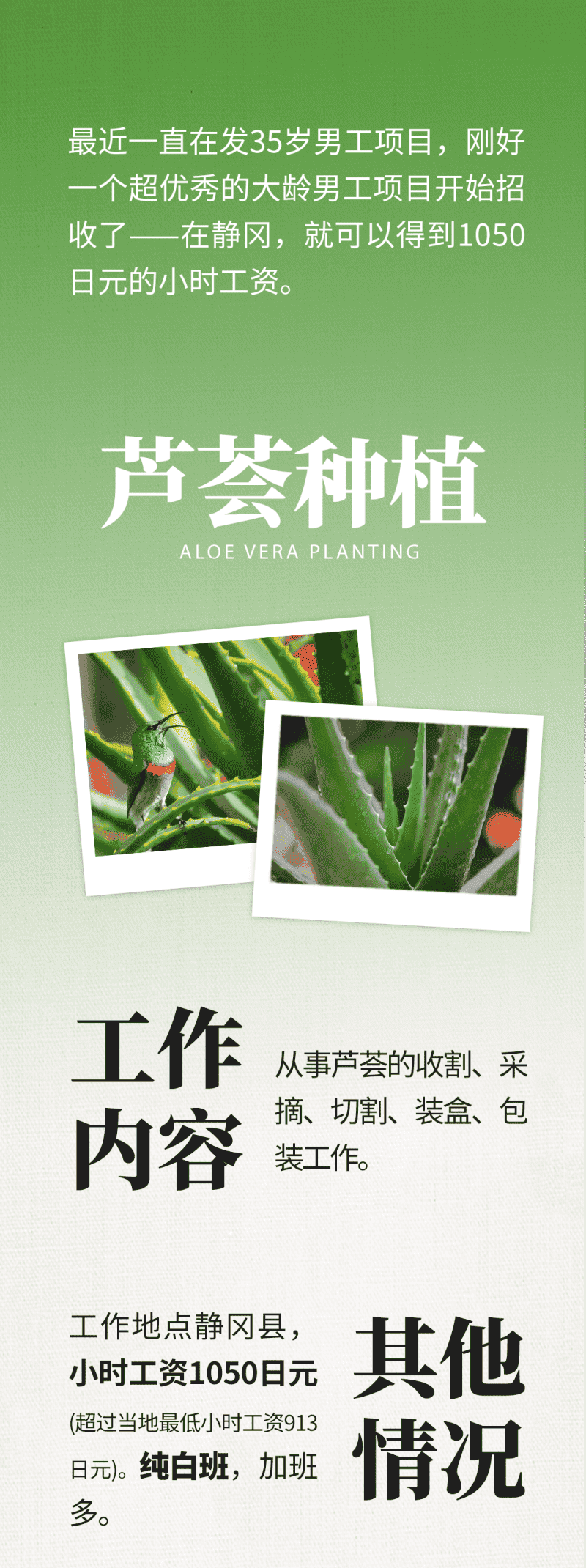 [日本] 優(yōu)質(zhì)項(xiàng)目 | 蘆薈種植男工項(xiàng)目,靜岡縣,小時(shí)工資1050日元的優(yōu)秀項(xiàng)目