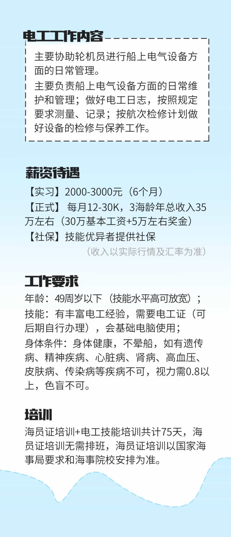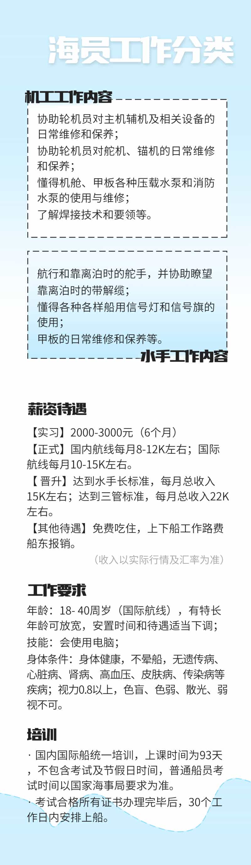 考試通過30工作日內(nèi)辦理《海員船員培訓合格證書》、《服務薄》、 《海員證》、《海員船員健康證書》、MLC(海員廚師培訓合格證) 。