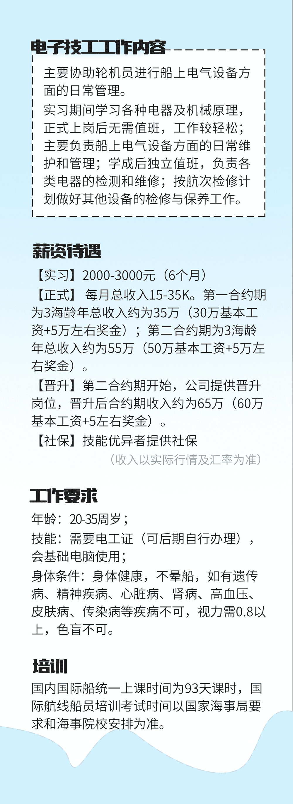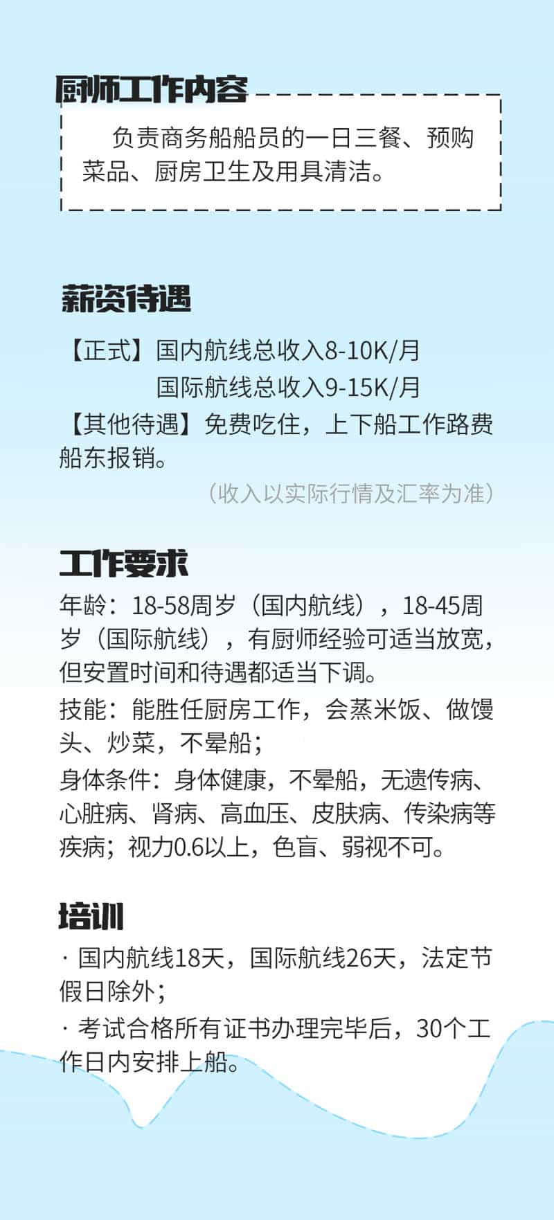 培訓優(yōu)勢:培訓大小證連讀,縮短培訓周期。廚師培訓周期為18-26天,海員培訓周期為三個半月。培訓經(jīng)驗充足,培訓通過率高。